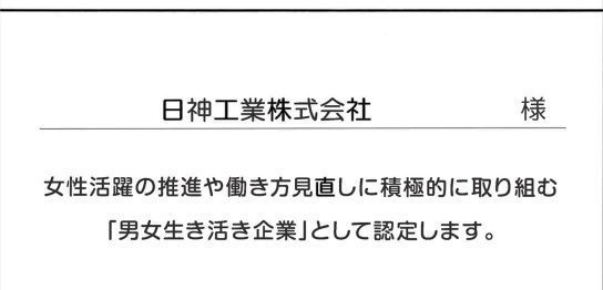 この度、日神工業株式会社は、栃木県が認定する「男女生き活き企業」の認定を更新いたしましたことをご報告申し上げます。 「男女生き活き企業」とは、女性活躍の推進や働き方の見直しに積極的に取り組み、誰も